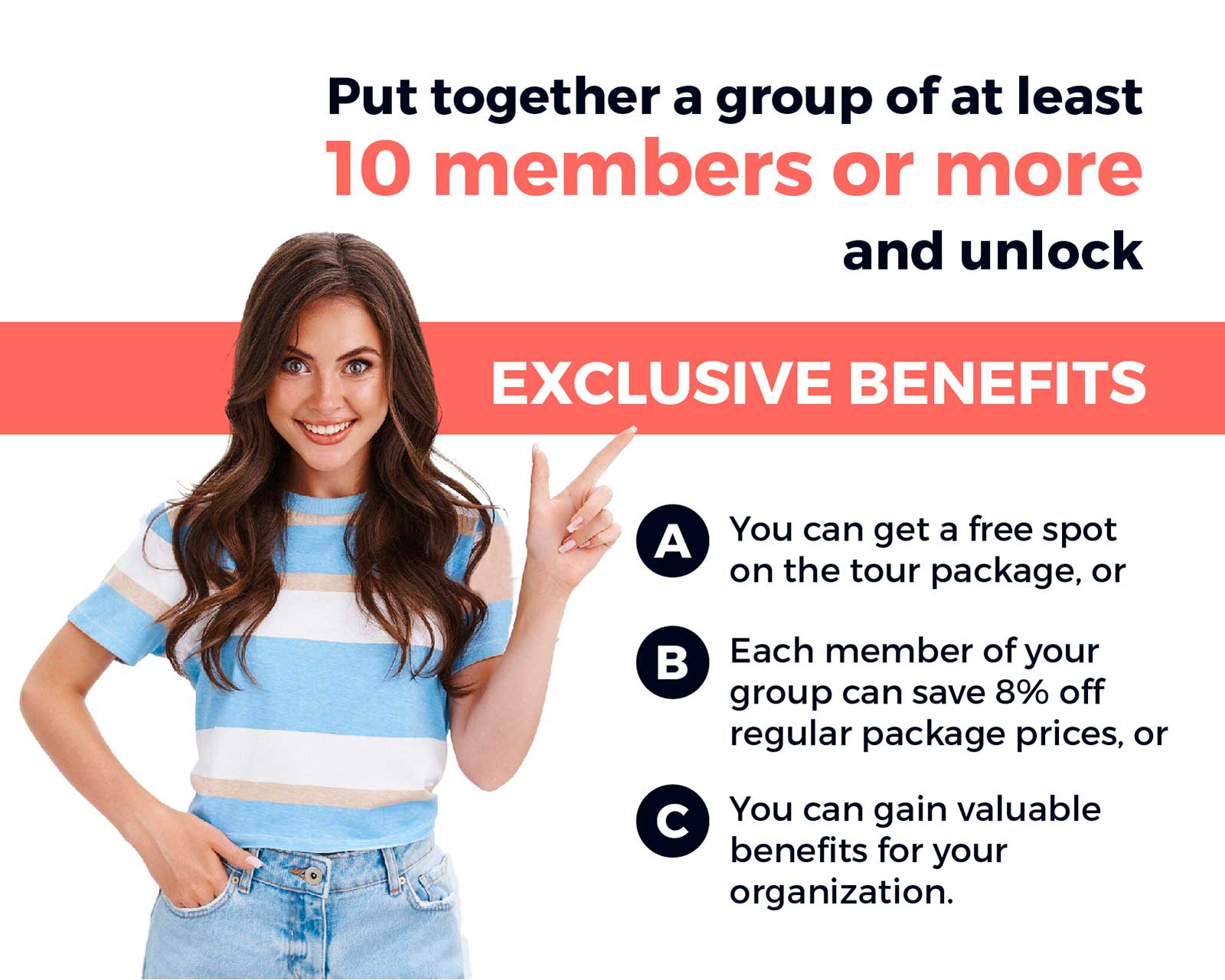 Además, obtén beneficios exclusivos como descuentos para tus acompañantes, un cupo gratis o una comisión como líder de grupo.